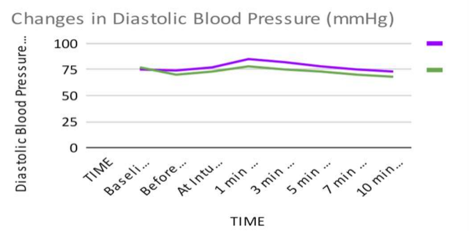 The DBP at baseline was comparable in both the groups and there was statistically no significant difference between the two groups (p value >0.05). Before induction, there was a decrease in DBP in both the groups which was more in Group D as compared to Group L and there was statistically significant difference between the two groups (p value <0.05). At intubation, at 1,3 and 5 minutes after intubation, DBP increased in Group L as compared to group D and the difference was statistically highly significant between the two groups ( p value< 0.001). At 7 and 10 minutes after intubation, DBP decreased below the baseline in both the groups, which was more in Group D as compared to Group L and the difference was statistically highly significant between the two groups (p value <0.001).P Eniya et al[4]found that the difference in mean DBP between both the groups was statistically significant at Intubation, 1,3 minutes post intubation.