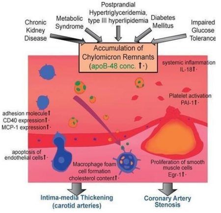 Legend: Many metabolic disorders are associated with the accumulation of chylomicron remnants and high concentrations of apolipoprotein B-48, such as Chronic Kidney Disease, Metabolic Syndrome, Impaired Glucose Tolerance, Diabetes Mellitus, Postprandial Hypertriglyceridemia and Type III Hyperlipidemia. In serum, chylomicron remnants can directly penetrate into the arterial wall and infiltrate the subendothelial space, contributing to systemic inflammation, platelet activation, smooth muscle cell proliferation, monocyte adhesion, endothelial cell apoptosis, and the proliferation of foam cells rich in cholesterol. Atherosclerotic tissues exhibit a significantly higher concentration of chylomicron remnants, suggesting it is a primary cause of atherosclerosis.