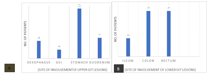 Figure 1: Sitewise distribution of: (A) upper GIT lesions (B) lower GIT lesions