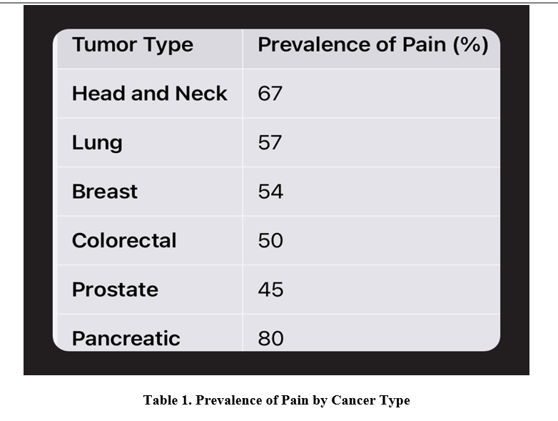Cancer pain affects up to 70% of patients with advanced disease [2]. Prevalence varies by cancer type and stage (see Table 1).