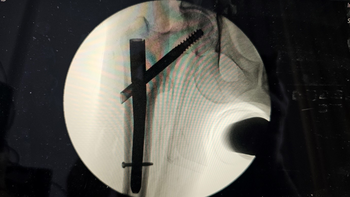 Postoperative X-rays were inconclusive due to suboptimal views. To evaluate screw position and fracture alignment more accurately, a CT scan was performed. The CT revealed that the cephalic screw had cut through the femoral neck, protruding medially outside the cortex, and continued into the femoral head—confirming a case of cut-through.