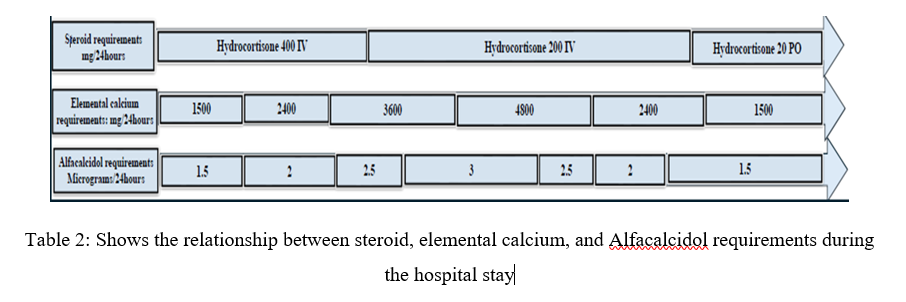 Table 2: Shows the relationship between steroid, elemental calcium, and Alfacalcidol requirements during the hospital stay