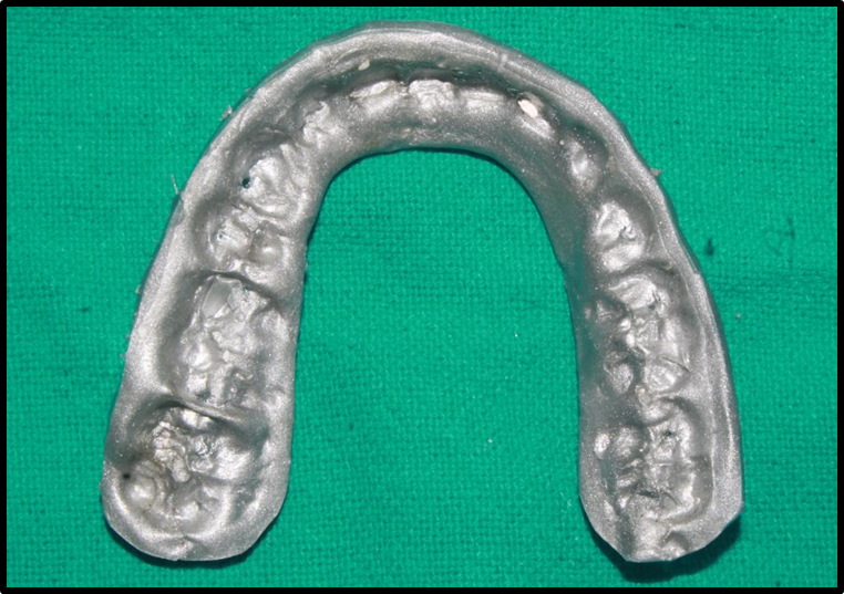 Occlusal records were obtained from all patients at two points of time i.e immediately after debonding (T0) and after three months (T1), using Aluwax bite registration. Subjects were made to sit upright, and softened Aluwax was placed on the mandibular occlusal surfaces. Patients were guided to bite in maximum intercuspation firmly and maintain the position for about two minutes. In cases where the initial registration was inadequate due to insufficient material or improper placement, a second bite registration was performed.[Figure 2]