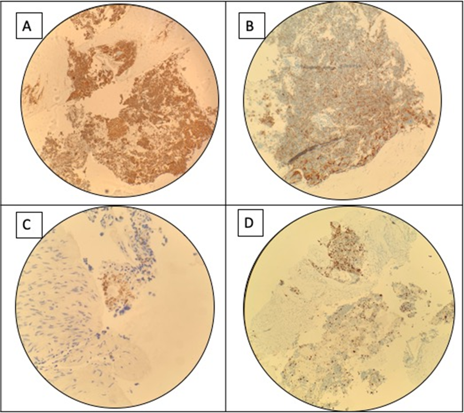 Endoscopic ultrasound–guided biopsy of the pancreatic mass confirmed a well-differentiated neuroendocrine tumor, positive for chromogranin, synaptophysin, and ACTH, establishing it as the source of ectopic ACTH production (Figure 4A–3C). Ki-67 proliferation index was 27%, consistent with a World Health Organization grade 3 neuroendocrine tumor with poor prognosis (Figure 4D). The hospital course was further complicated by refractory hypokalemia and severe hyperglycemia, both attributed to hypercortisolism.