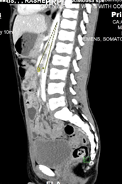 Fig 4: Sagittal image of IV contrast enhanced CT scan of the abdomen demonstrates aortomesenteric sharp angle ( 9°) (Normal range > 22°).