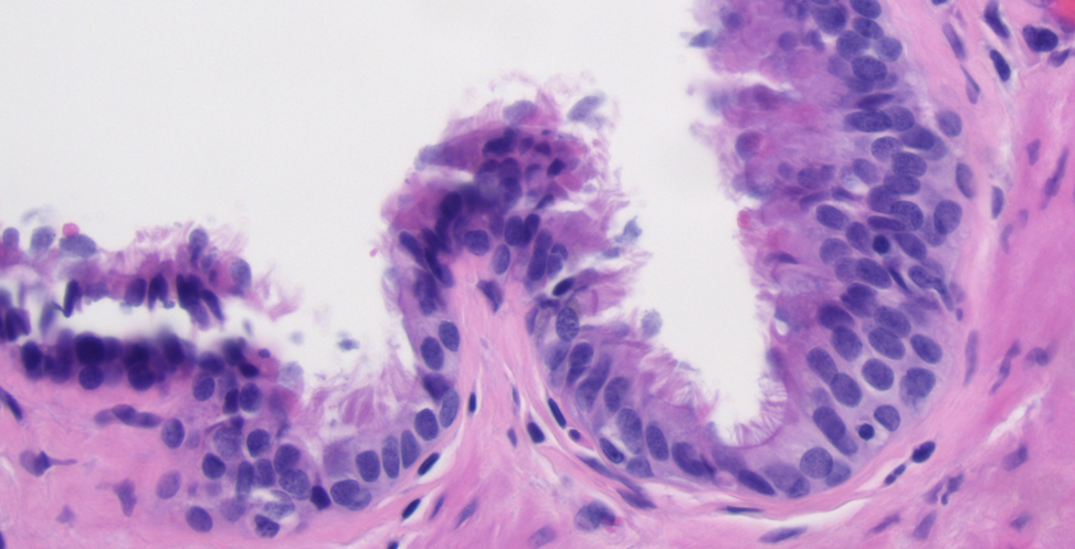 Figure 4. High power view (40 x) of an H&E stained section of the cyst lining demonstrating the ciliated columnar epithelium