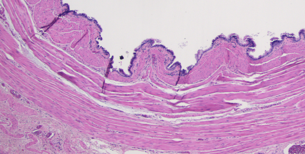 Fig. 5. Low Power view (4x) of an H&E stained section of showing cystic structure with a well-developed smooth muscle layer forming the wall and lined by ciliated columnar epithelium. No cartilage identified.
