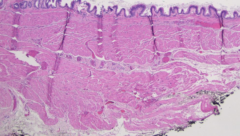 Fig. 6. Another low power view (4x) of an H&E stained section of the esophageal duplication cyst demonstrating well-developed double smooth muscle layer.