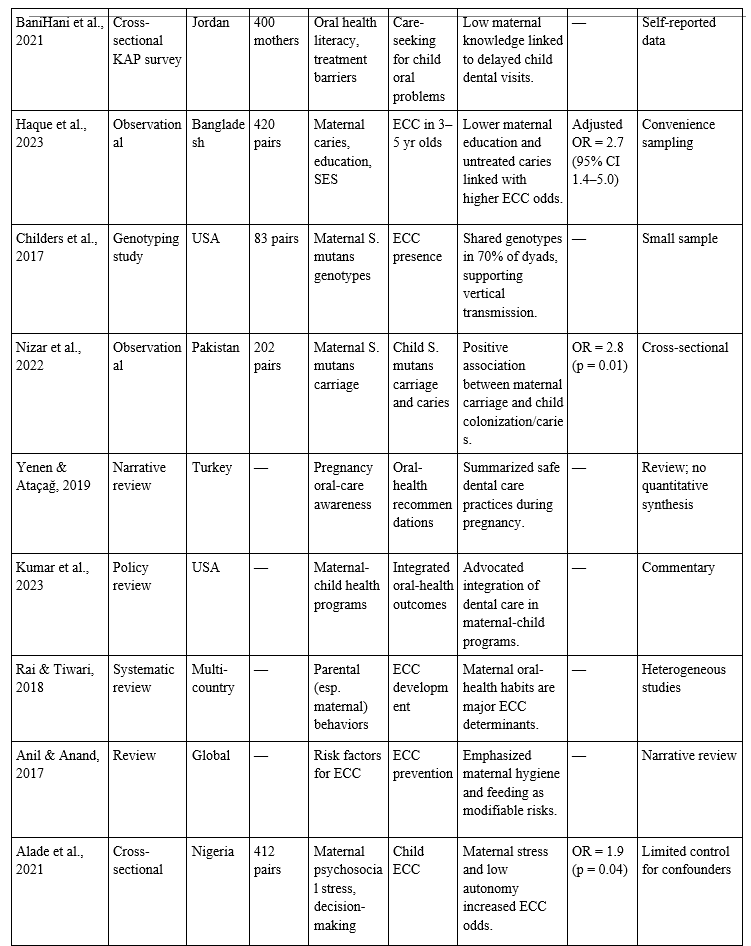 Conclusions: Maternal oral health appears to be an important determinant of early infant oral outcomes. Priorities include prenatal dental-care access, maternal oral-health education, and longitudinal intervention trials to determine whether improving maternal oral health reduces ECC incidence.