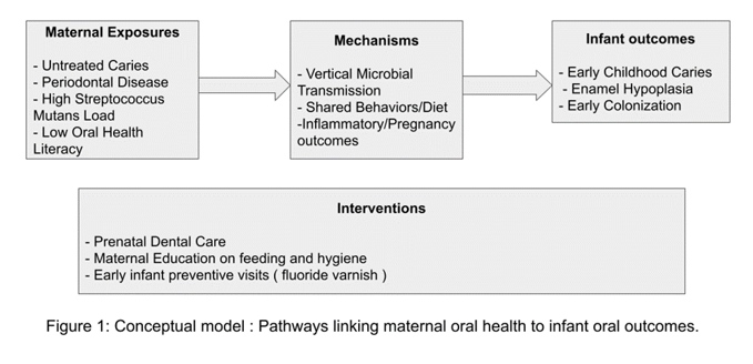 Early life represents a pivotal period for oral-health trajectories. Maternal oral health can shape infant oral outcomes through multiple pathways: direct vertical microbial transmission (e.g., Streptococcus mutans), shared household behaviors and dietary patterns, and pregnancy-related biological mechanisms (e.g., systemic inflammation associated with maternal periodontal disease that may influence pregnancy outcomes). Understanding these linkages is important for designing preventive strategies that begin in pregnancy and extend into the first years of life.