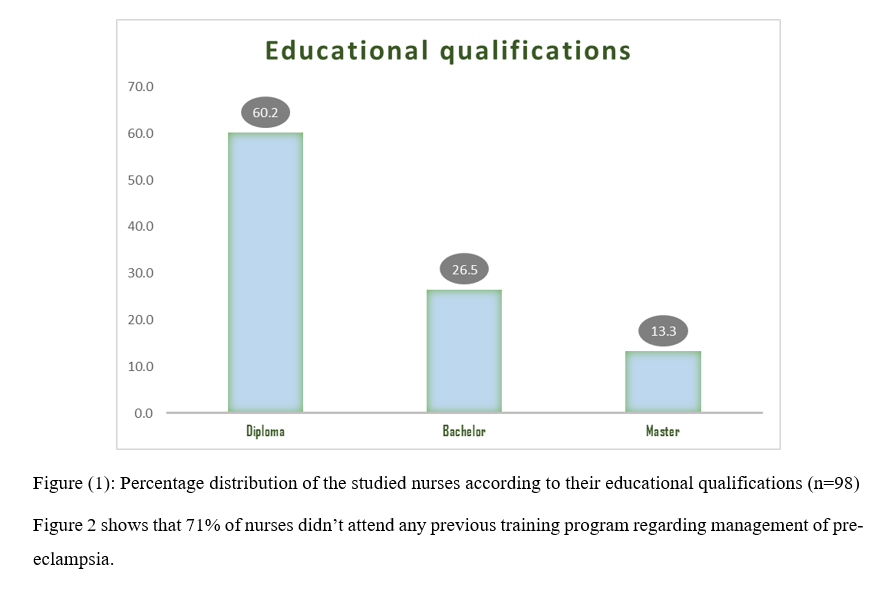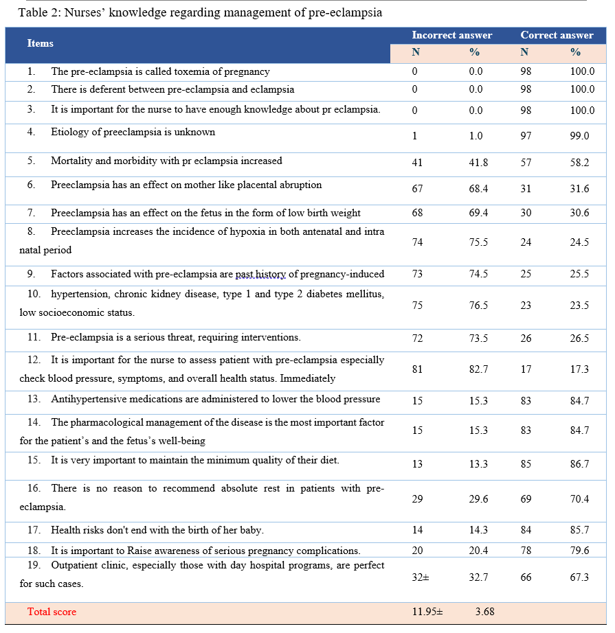Data were presented as tables and figures presenting nurses' knowledge and attitude regarding management of pre-eclampsia.