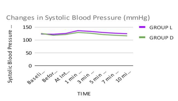 In our study, The SBP at baseline was comparable in both the groups and there was statistically no significant difference between the two groups (p value >0.05). Before induction, there was a decrease in SBP in both the groups which was more in Group D as compared to Group L and there was statistically significant difference between the two groups (p value <0.05). At intubation, at 1,3 ,5 and 7 minutes after intubation, SBP increased in Group L as compared to group D and the difference was statistically highly significant between the two groups ( p value < 0.001). At 10 minutes after intubation, BP decreased below the baseline in both the groups,which was more in Group D as compared to Group L and the difference was statistically highly significant between the two groups (p value <0.001). Tanushree V. et al[3] studied IV Dexmedetomidine (1 mcg/kg) and IV Lignocaine (1.5 mg / kg) in attenuation of the pressor response and found that the difference in mean SBP from 1 min upto 10 min after intubation between Group L and Group D was statistically significant. (p<0.001).