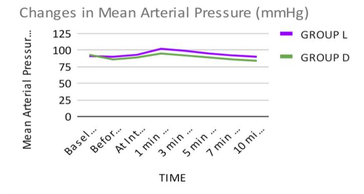 The MAP at baseline was comparable in both the groups and there was statistically no significant difference between the two groups (p value >0.05). Before induction, there was a decrease in MAP in both the groups which was more in Group D as compared to Group L and there was statistically significant difference between the two groups (p value <0.05). At intubation, at 1,3, 5 and 7 minutes after intubation, MAP increased in Group L as compared to group D and the difference was statistically highly significant between the two groups ( p value< 0.001). At 10 minutes after intubation, MAP decreased below the baseline in both the groups, which was more in Group D as compared to Group L and the difference was statistically highly significant between the two groups (p value <0.001).