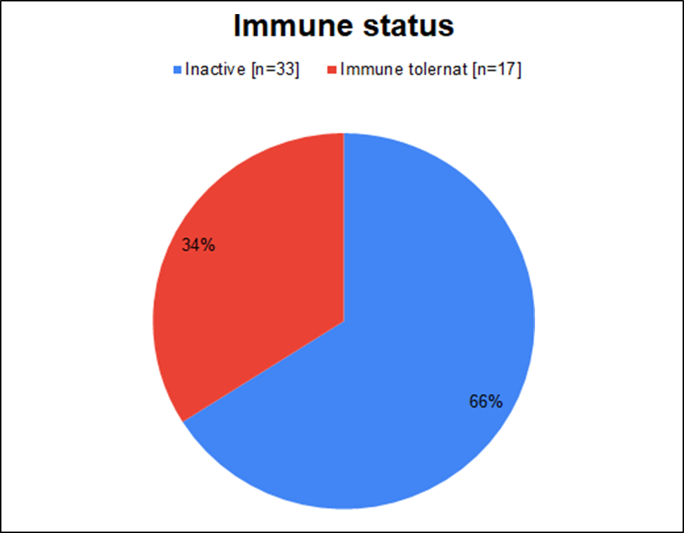 Immune tolerant phase diagnosed by the presence of serum HBeAg and very high levels of HBV (>1 million IU/ml), while the inactive HBsAg carrier state is diagnosed by absence of HBeAg and undetectable or low levels of HBV DNA in PCR-based assays (<20,000 IU/ml). In this study showed that, 33(66%) patients were inactive carriers and 17(34%) were immune tolerants.