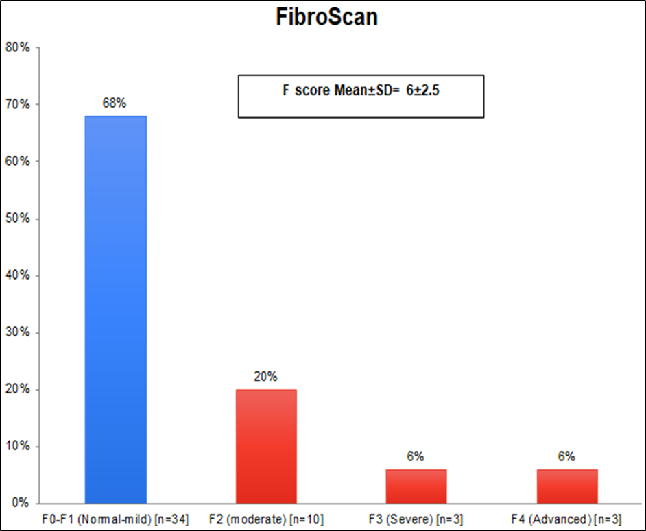 The FibroScan results showed that, the mean of fibrosis score was 6±2.5 KPa, and 12% of patients had significant fibrosis (F3 and 4). Our rate was in accordance with studies of San Juan L et al (15%) (7), Amr A et al (20%) (88) and Wong V et al (15%) (89).