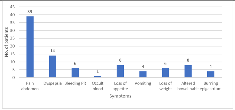The predominant clinical symptom among the cases who underwent endoscopic biopsies was pain in abdomen (86.67 %) followed by dyspepsia (31.11%), loss of appetite (17.77%), altered bowel habit (17.77%), loss of weight (13.33%), vomiting (8.88%) and burning epigastrium (8.88%). (Fig.2).