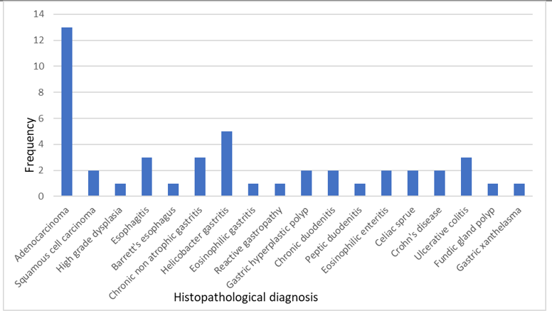 Similarly, in the lower GI tract, histopathological diagnoses included adenocarcinoma, Crohn's disease, and ulcerative colitis. (Fig.3)