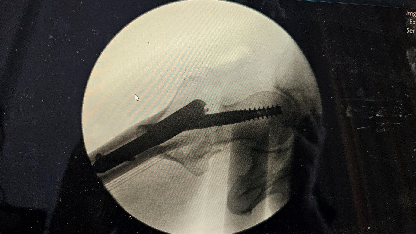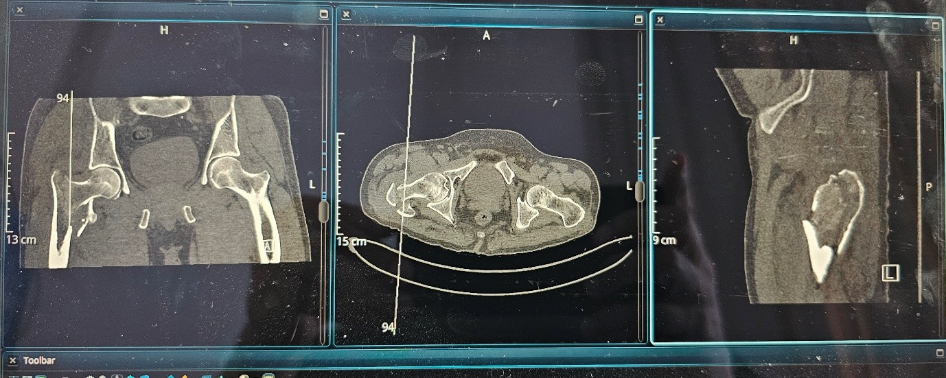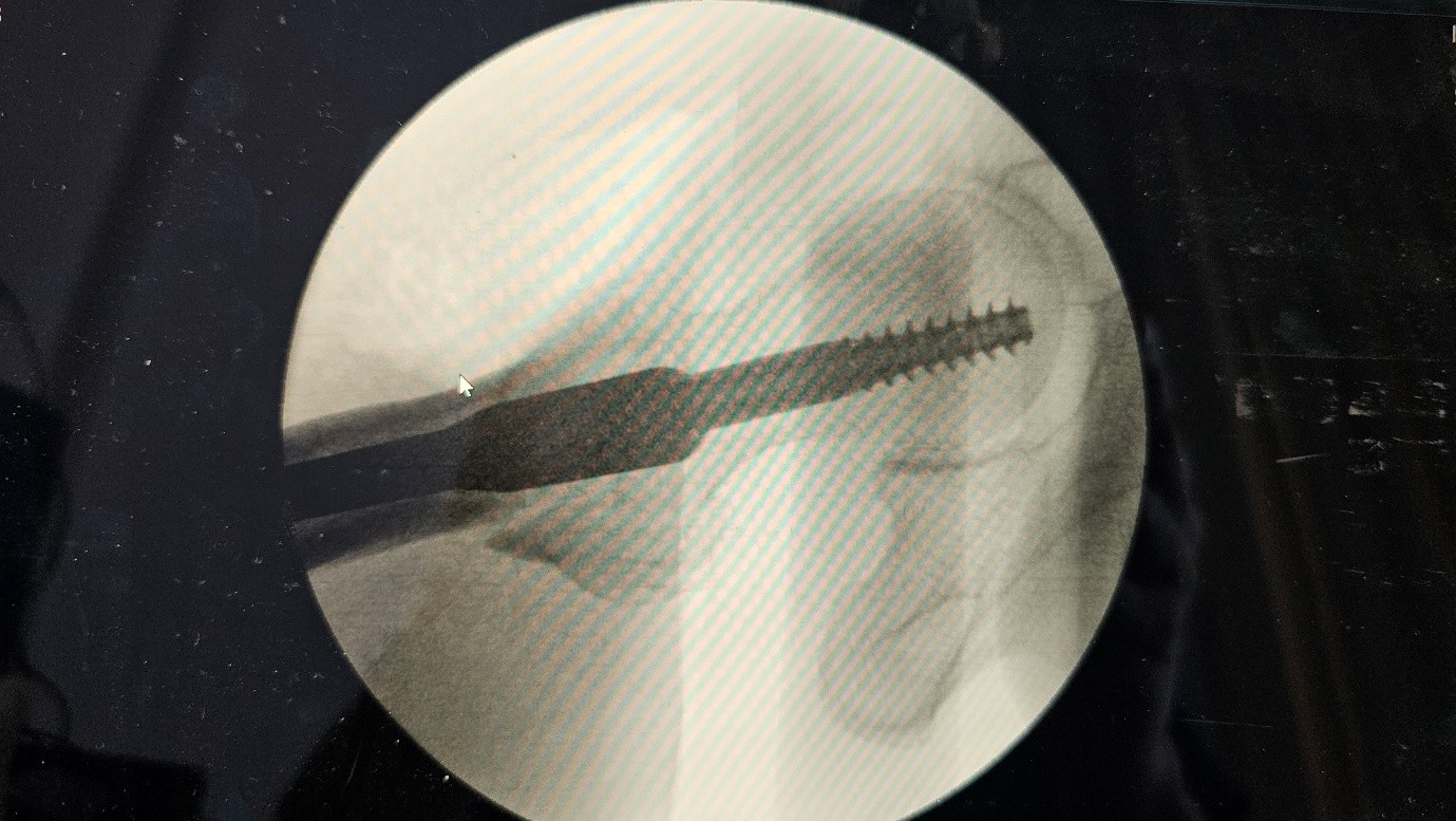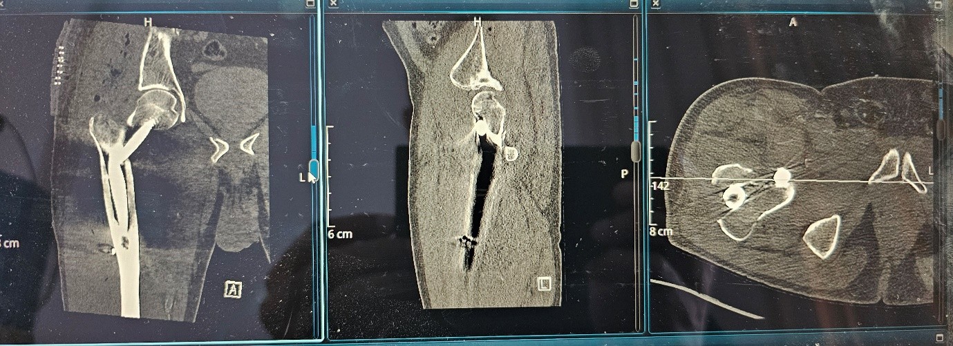 Postoperative X-rays were inconclusive due to suboptimal views. To evaluate screw position and fracture alignment more accurately, a CT scan was performed. The CT revealed that the cephalic screw had cut through the femoral neck, protruding medially outside the cortex, and continued into the femoral head—confirming a case of cut-through.