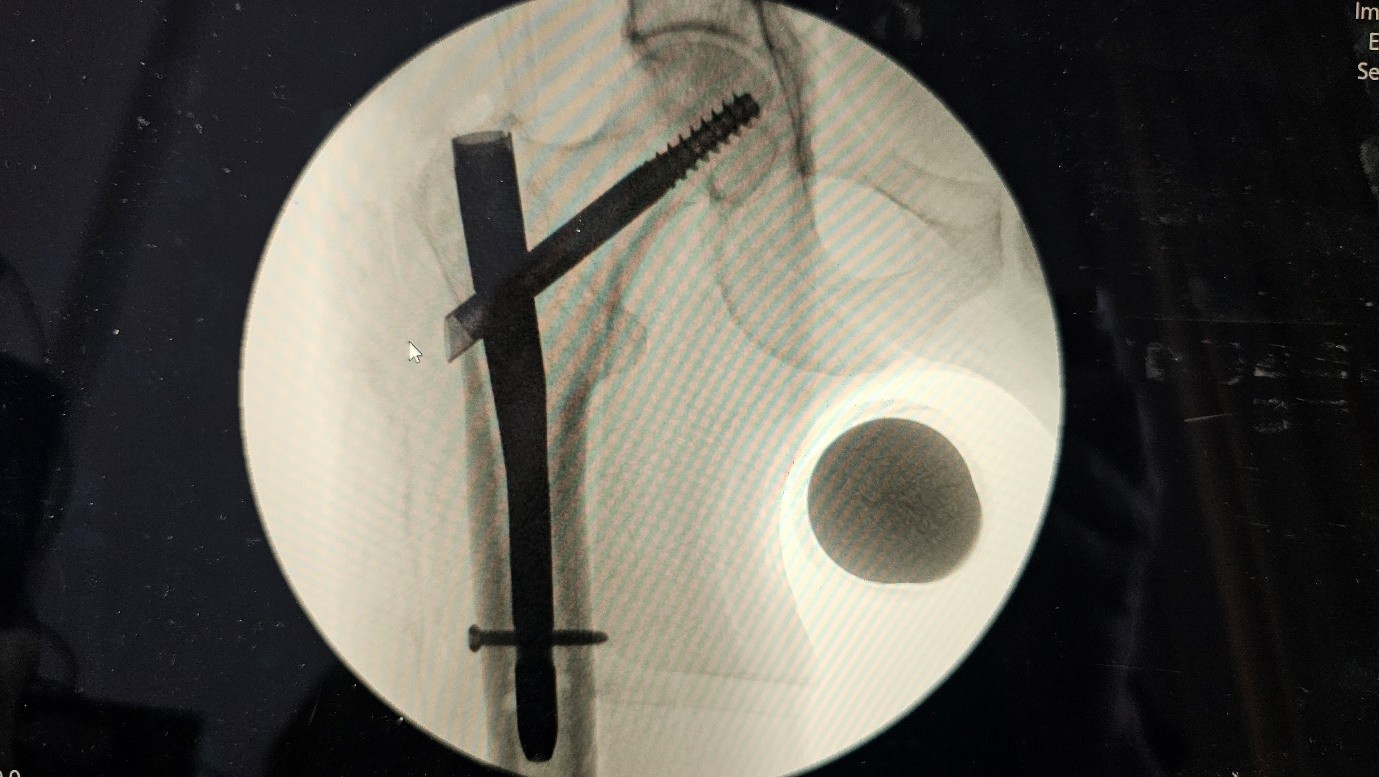 The patient, a 75-year-old female, presented to the emergency department following a fall at home. Radiographic evaluation revealed a comminuted intertrochanteric femur fracture on the right side. The patient was admitted for surgical management after appropriate medical and anesthetic clearance.