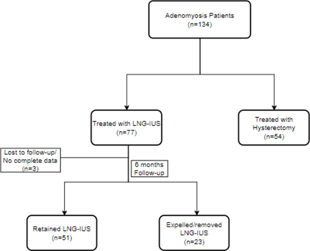 In this study, we intend to evaluate the characteristics of AD patients managed with either hysterectomy or LNG-IUS and explore the factors associated with the retention of LNG-IUS. Additionally, we studied the effect of LNG-IUS on pain levels in AD patients.