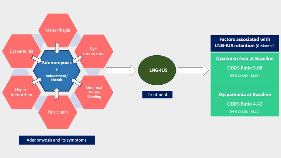 Currently, there are multiple treatment options for patients diagnosed with AD. Hysterectomy being the most well-established treatment with minimal risk of recurrence of disease, another being LNG-IUS. The long-term use of LNG-IUS proves effective and acceptable for managing symptomatic AD. Our study agrees with this and underscores the clinical efficacy and challenges associated with LNG-IUS treatment in AD patients. LNG-IUS which can be used in the treatment of AD either alone or in adjunct with conservative treatments/ other pharmacological therapies. LNG-US significantly alleviates pain related to AD at 1M, 3M & 6 months. Our subgroup analysis of patients treated with LNG-IUS for AD revealed a 6-month retention rate of 68.92%. The factors influencing device retention included baseline symptoms such as dysmenorrhea and dyspareunia.