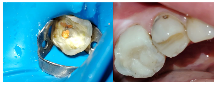 Figure 4. Clinical photographs before and after treatment (rubber dam isolation and final composite restoration)