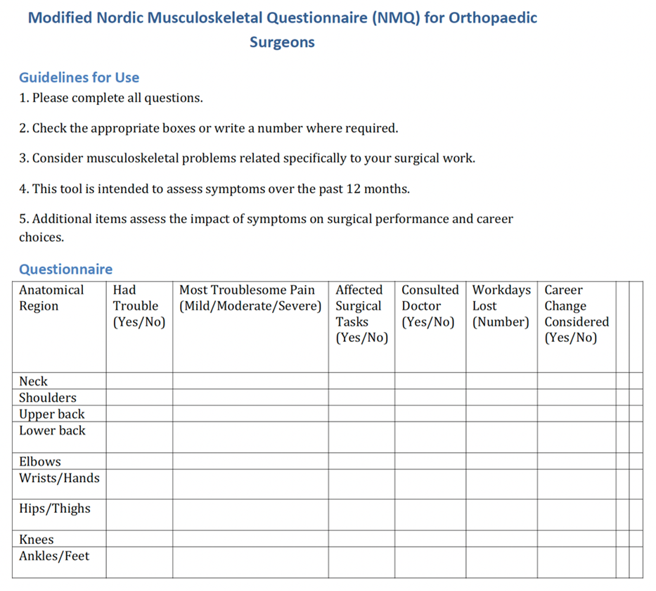 4. Musculoskeletal Symptoms: The original NMQ was adapted to suit the occupational context of orthopaedic surgeons (12,13). We retained the core structure assessing symptoms in nine anatomical regions (neck, shoulders, upper back, lower back, elbows, wrists/hands, hips/thighs, knees, and ankles/feet) over the past 12 months. Additional items were added to assess pain intensity, impact on surgical tasks, medical consultations sought, workdays lost due to MSDs, and consideration of career change due to symptoms. These additions provided a more comprehensive view of the professional impact of MSDs among surgeons. Internal consistency of the survey tool was not formally assessed in this study. However, the musculoskeletal symptoms section was based on the widely validated NMQ, which has demonstrated high reliability in previous occupational health studies.
