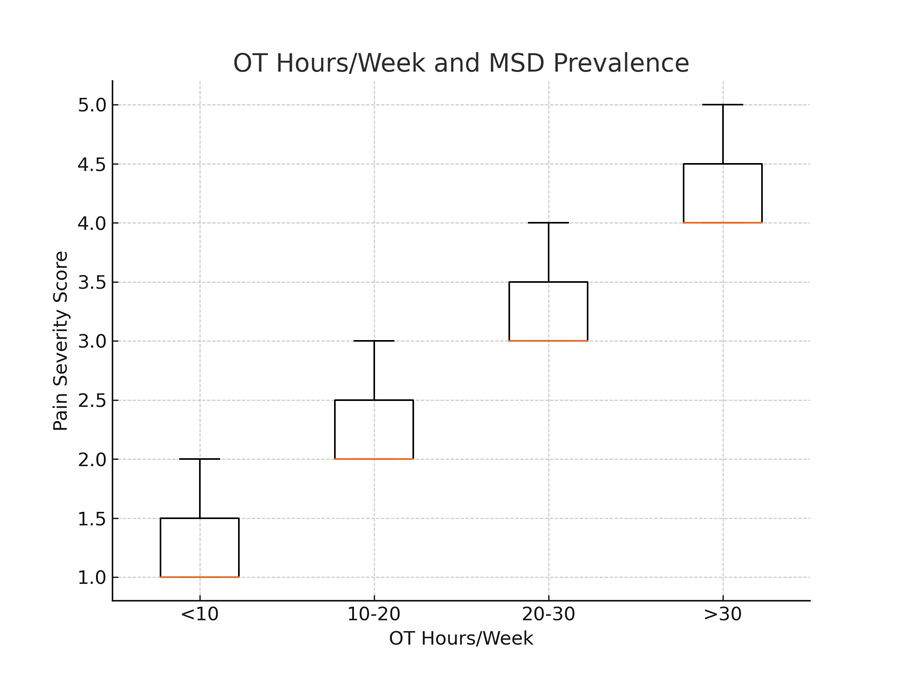 Figure 2 : Relationship between operation theatre (OT) hours per week and musculoskeletal disorder (MSD) pain severity scores. (The mean pain severity score increases progressively with higher OT hours, indicating a positive association between workload and MSD severity. Error bars represent standard deviations).