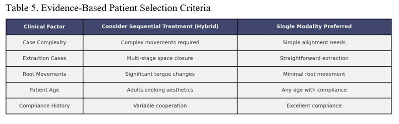 Clinicians implementing sequential protocols should establish clear expectations from the onset of treatment. Patients should understand that hybrid treatment may require a longer overall duration but can initially provide superior biomechanical control, followed by aesthetic benefits. Regular progress discussions, visual treatment simulations, and flexibility in timing transitions based on life events (such as graduations, weddings, or professional changes) can enhance patient satisfaction and compliance throughout the sequential treatment process.
