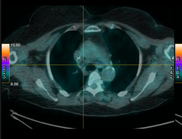 Case Presentation: We present the case of a patient undergoing surveillance for metastatic endometrial cancer who was found to have suspicious mediastinal lymphadenopathy. Her prior exposure to radiotherapy and chemotherapy complicated the diagnostic evaluation.