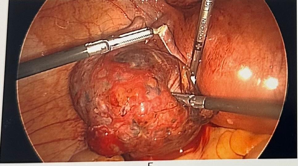This patient had a background history of endometriosis and had x2 laparoscopic ovarian cystectomies in the past. She had a blocked left tube seen on a Hycose test in Italy before. Her Serum HCG was negative 2 days before the Hycose.