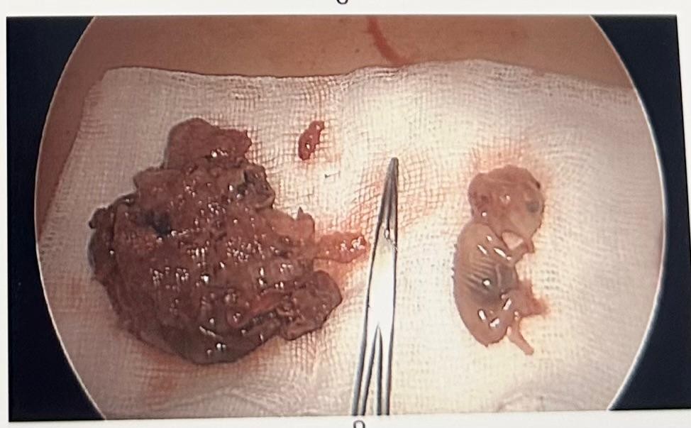 Upon presentation, she had brownish vaginal discharge and mild abdominal pain.