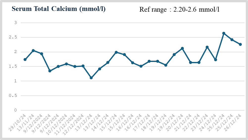 However, her clinical course was complicated by recurrent and refractory hypocalcaemia, with serum calcium levels fluctuating between 1.40 and 2.10 mmol/L (reference range: 2.20–2.60 mmol/L). This required repeated intravenous calcium infusions and significant escalation of calcium supplementation, including elemental calcium up to 4.8 g/day and alfacalcidol up to 3 µg/day.