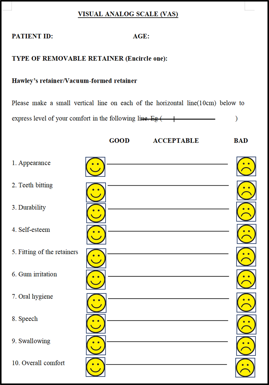 Subjects were evaluated three months after retainer placement (T1) using a 10-cm Visual Analogue Scale (VAS). It consisted of 10 questions related to retainer acceptance. Both oral and written instructions were provided to ensure proper completion of the questionnaire, which ranged from 0 (most favorable response) to 10 (least favorable). The assessments were conducted in the presence of the treating doctor. [Figure 3]