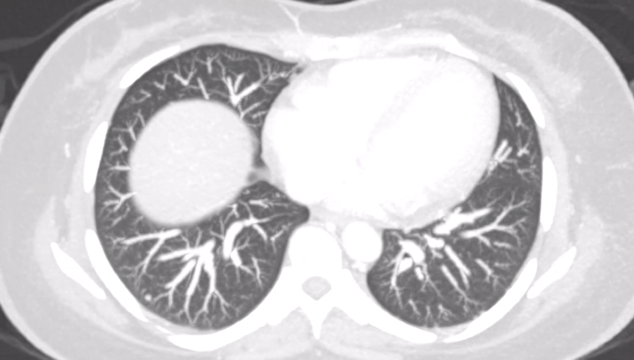 Figure 2: Axial view of chest computed tomography with contrast revealing subcentimeter calcified pulmonary nodules.