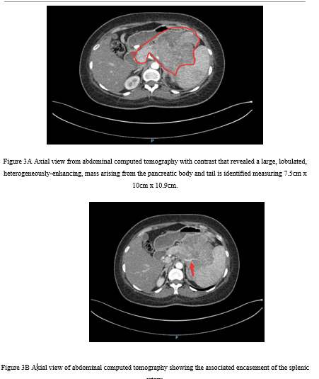 Figure 3A Axial view from abdominal computed tomography with contrast that revealed a large, lobulated, heterogeneously-enhancing, mass arising from the pancreatic body and tail is identified measuring 7.5cm x 10cm x 10.9cm.