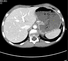 Fig 1: Axial image of IV contrast enhanced CT scan of the abdomen demonstrates gastric dilatation.