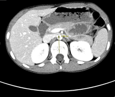 Fig 2 :Axial image of IV contrast enhanced CT scan of the abdomen demonstrates aortomesenteric narrowing (4 mm) (Normal range > 10 mm).