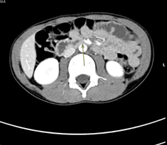 A 11 years old male patient, diagnosed at our hospital with a growth hormone deficiency and severe short stature. He had been receiving growth hormone (GH) replacement therapy for over a year. After a year from starting GH treatment, he was complaining of persistent vomiting after every oral intake and abdominal pain when he was first seen. For a month, there was intermittent pain in the umbilical region that was exacerbated by food intake and subsided by fasting or vomiting. There was no past history of eating from outside, abdominal trauma, or interaction with sick individuals. Neither constipation nor diarrhea. He has never shown up with these symptoms before. No history of previous admissions. He was taking growth hormone till two months back, and during that time, his height climbed by more than 15 cm (from 122 to 137 cm) over 16 months. His weight remained constant at 29 kg, and his BMI was 15.5 kg/m2, which is below average.