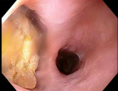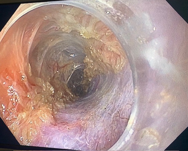 Figure 2: Procedural esophagogastroduodenoscopy showing a Zenker diverticulum with food and luminal contents.