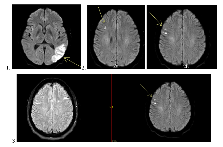 Figures 1, 2, and 3 are axial diffusion-weighted images (DWI) from the patient’s MRI. Figure 1 demonstrates the new left occipitotemporal infarct, while Figures 2a and 2b show the subacute infarcts in the lateral right frontal lobe. Figure 3 presents the DWI and FLAIR images for the subacute infarcts in the right frontal lobe.