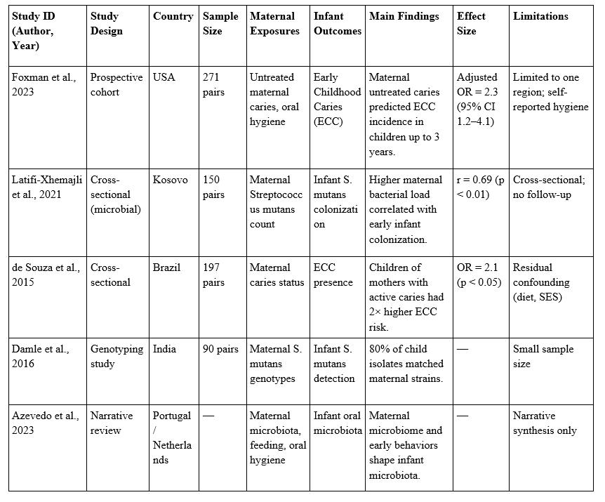 Titles and abstracts were screened for relevance. Full texts for potentially eligible studies were retrieved. Data were extracted into a standardized spreadsheet recording: author/year, country, study design, sample size, maternal exposure(s), infant outcome(s), principal finding(s), effect measures when reported, and study limitations. Because included studies varied in design and outcome measurement, I performed a narrative synthesis organized by a priori themes: microbial transmission, maternal caries and ECC, periodontal disease and pregnancy/infant outcomes, and maternal knowledge/behavior/interventions.