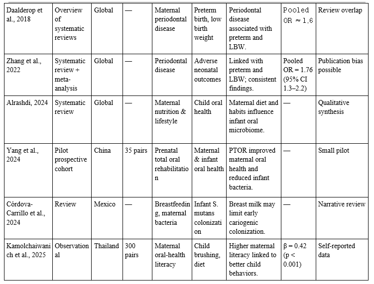 Background: Maternal oral health may influence infant oral outcomes through biological, behavioral, and social pathways. Clear synthesis of recent, freely accessible evidence can inform prenatal and early-life preventive strategies.