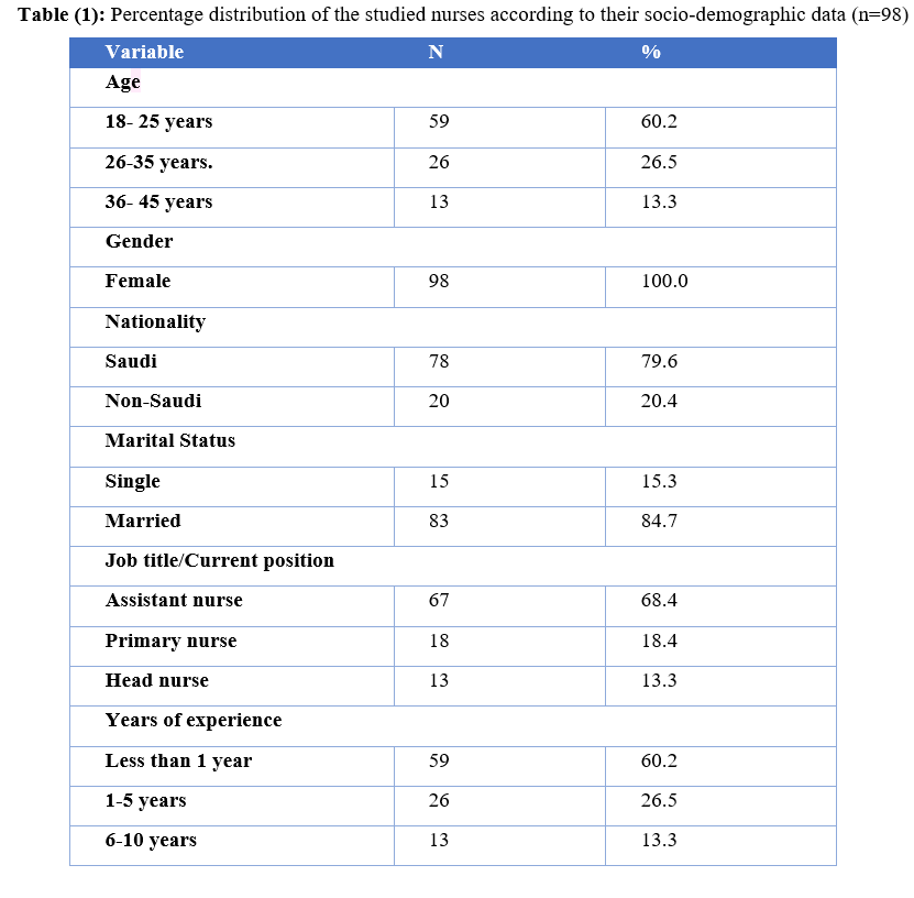 Regarding sociodemographic data of the study group, the age distribution ranged between 18 and 45 years. The majority of them were in the age group 18- 25 years, while a few of them were in the age group 36- 40 years. Considering sex distribution of nurses, all of them were females and married. For the level of education of the participants the majority of them had a diploma degree while few nurses had master's degree, regarding job title/current position were assistant nurse and had less than 1 year for experience in the setting. The majority of nurses were Saudi nationality.