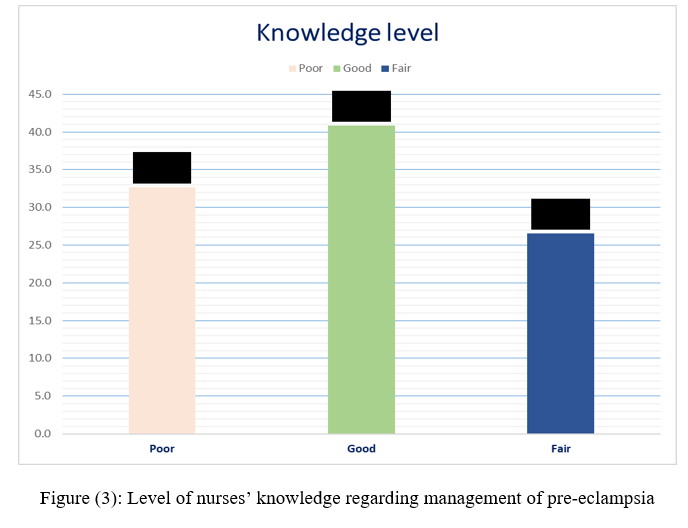 Our results showed the level of nurses’ knowledge regarding management of pre-eclampsia, it was found that less than half had good knowledge, nearly one fourth were poor, then those with fair knowledge score. Similarly, the current findings were consistent with what is reported in study done by Nkamba et al., (2020) who reported HCP have an adequate knowledge on managing pre-eclampsia/eclampsia.