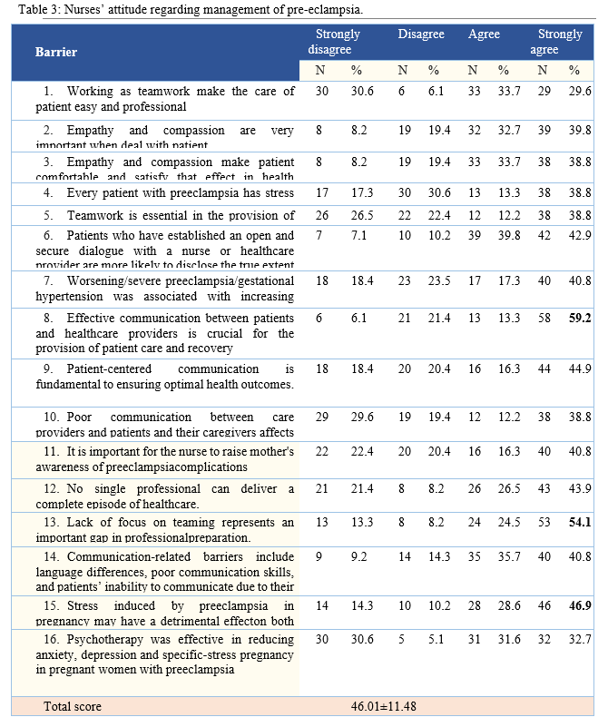 For the level of education of the participants the majority of them (60.2%) diploma degree, (26.5%) had had bachelor's degree and while few nurses (13.3%) had master's degree (Table 1). About nationality 79.6% the majority of nurses were Saudi nationality (Table 1). Regarding marital status 84.7% were married, while 15.3 % were Single (Table 1). Regarding job title/current position 68.4 % were assistant nurse. And 60.2 had less than 1 year for experience.Table 2 shows nurses’ knowledge regarding management of pre-eclampsia it was found that the first four items of score knowledge were mostly correct answers by about 100.0%, and 99.0% respectively 1st (The pre-eclampsia is called toxemia of pregnancy), 2nd (There is deferent between pre-eclampsia and eclampsia), 3rd (It is important for the nurse to have enough knowledge about pr eclampsia), and 4th (Etiology of preeclampsia is unknown). With total score mean 11.95±3.68. (Table 2)Table 3 shows nurses’ attitude regarding management of pre-eclampsia. It was found that the studied nurses reported strongly agree regarding effective communication between patients and healthcare providers is crucial for the provision of patient care and recovery, lack of focus on teaming represents an important gap in professional preparation, and stress induced by preeclampsia in pregnancy may have a detrimental effect on both the mother and child.\ by the highest percentages as 59.2, 54.1, & 46.9 respectively (Table 3)Figure 4 shows the level of nurses’ attitude regarding management of pre-eclampsia. It was found that 42.9% of nurses were had positive attitude, followed by 35.7 were had neutral one, then those with negative attitude represent 21.4%.Figure 5 Correlation between nurses' knowledge and attitude regarding management of pre-eclampsia. It was found that there was a positive statistical correlation between studied nurses score of knowledge and attitude regarding management of pre-eclampsia, as increasing score of knowledge is associated with enhancement of their attitude and vice versa.