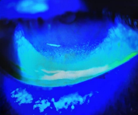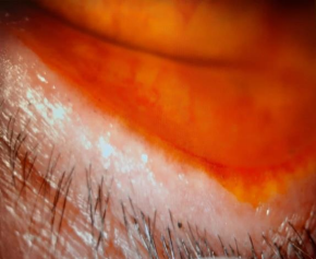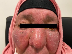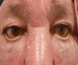 A 63-year-old woman who suffered from rosacae wich was complicated by rhinophyma (figure 1). She consulted for bilateral redness without a contexte of trauma persistant from 3 months and rebeliant to symptomatic treatment. Clinical findings objected bilateral ectropion (figure 2) with chronic free edge telangiectasia and severe dry eyes disease shown as inferior superficial punctate keratitis (figure 3 and 4). The therapeutic approach in this case was difficult and combined dermatological and ophtalmique treatments before considering any surgical intervention.