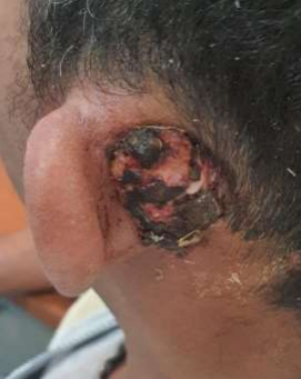On physical examination on the day of the consultation, the patient had a purplish-red mass covered with a spontaneously painful purulent secretion filling the external ECA down to the concha. The left retroauricular skin was swollen and painful, with stitches from the ENT biopsy (image 1).