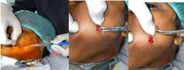 Figure1a) L.A. Administered Extraorally 1b) Tissue Dissection 1c) Foreign object retrieval