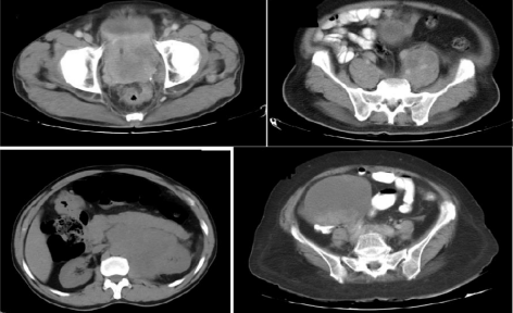 Fig 1(A): Computed Tomography (CT) of the pelvis showing large prostatic mass with infiltration of bladder base and seminal vesicles